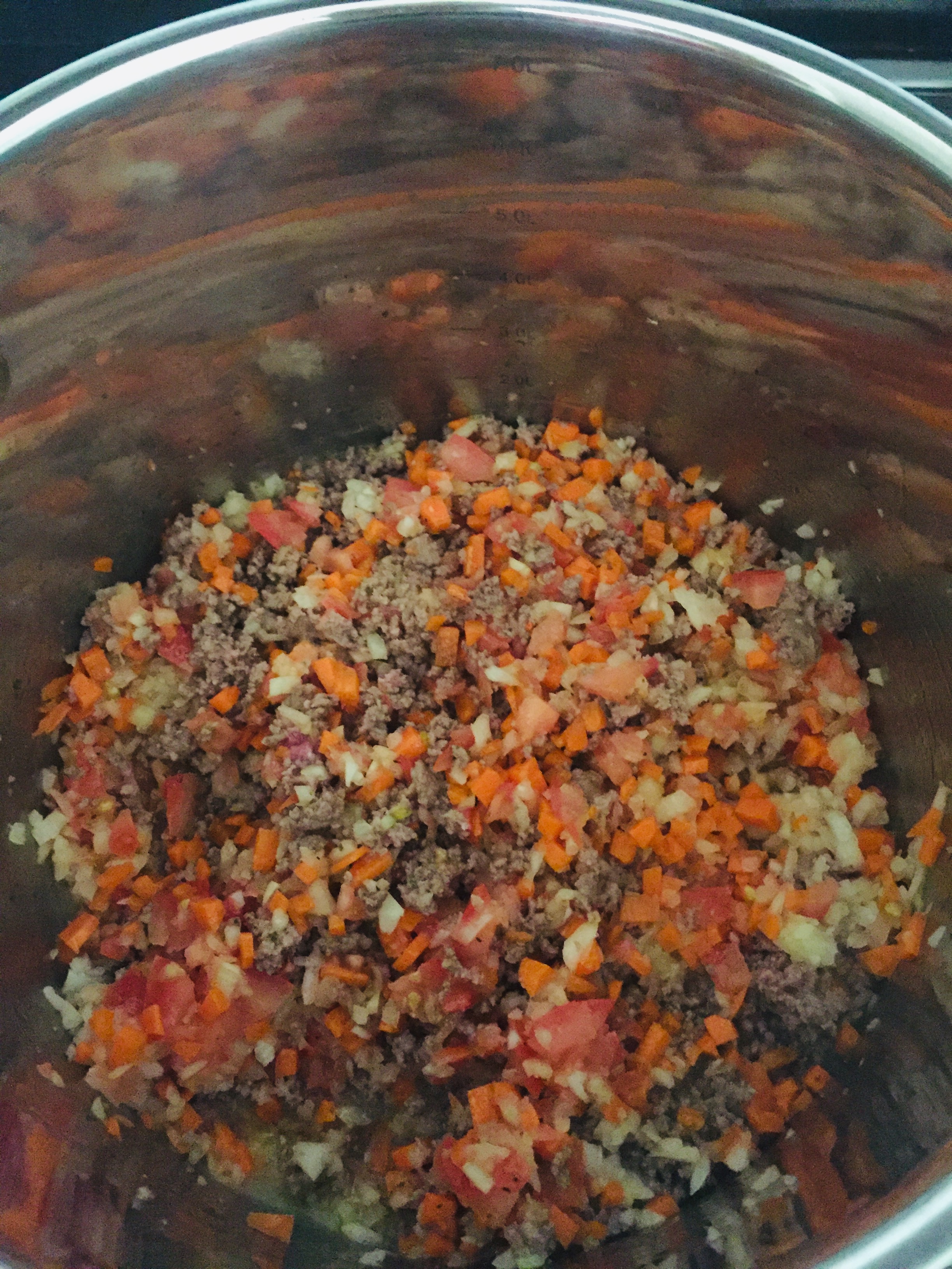고기가 어느 정도 갈색을 띠면 다져놓은 야채를 몽땅 넣고 아주 잠시 달달 볶습니다.