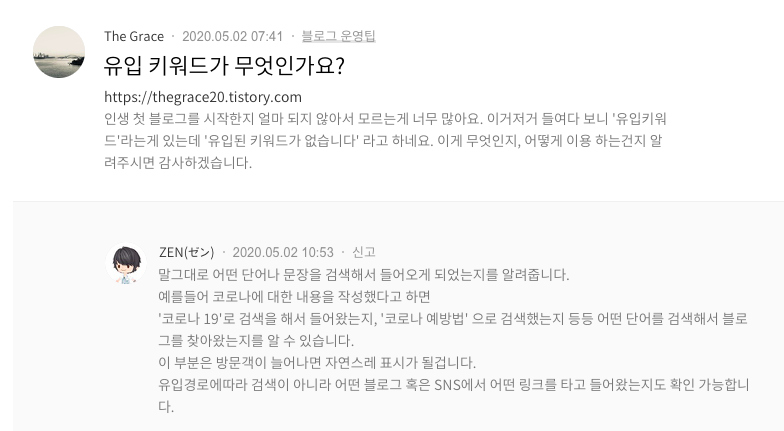 예를들어 코로나에 대한 내용을 작성했다고 하면 '코로나 19'로 검색을 해서 들어왔는지, '코로나 예방법' 으로 검색했는지 등등 어떤 단어를 검색해서 블로그를 찾아왔는지를 알 수 있습니다. 이 부분은 방문객이 늘어나면 자연스레 표시가 될겁니다. 유입경로에따라 검색이 아니라 어떤 블로그 혹은 SNS에서 어떤 링크를 타고 들어왔는지도 확인 가능합니다.