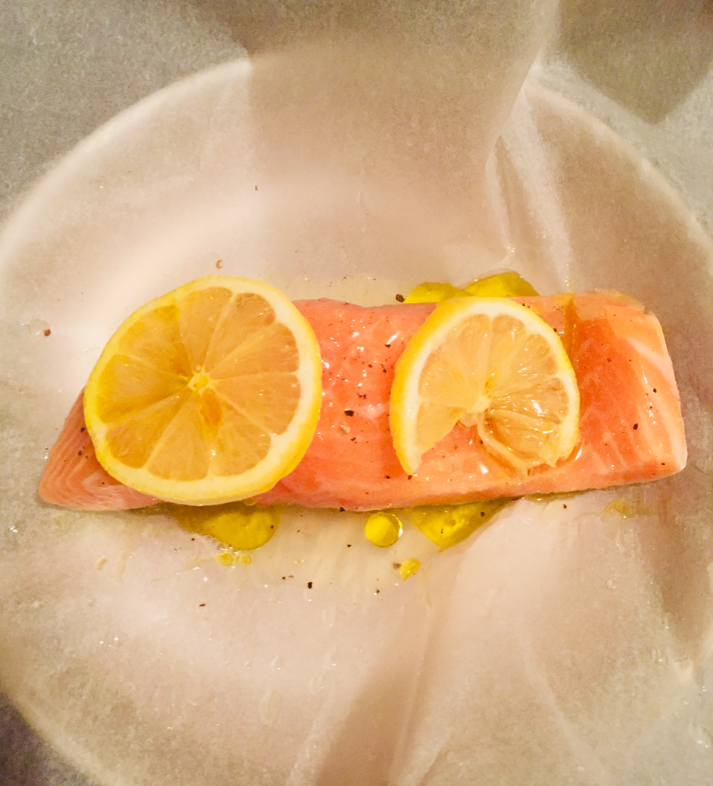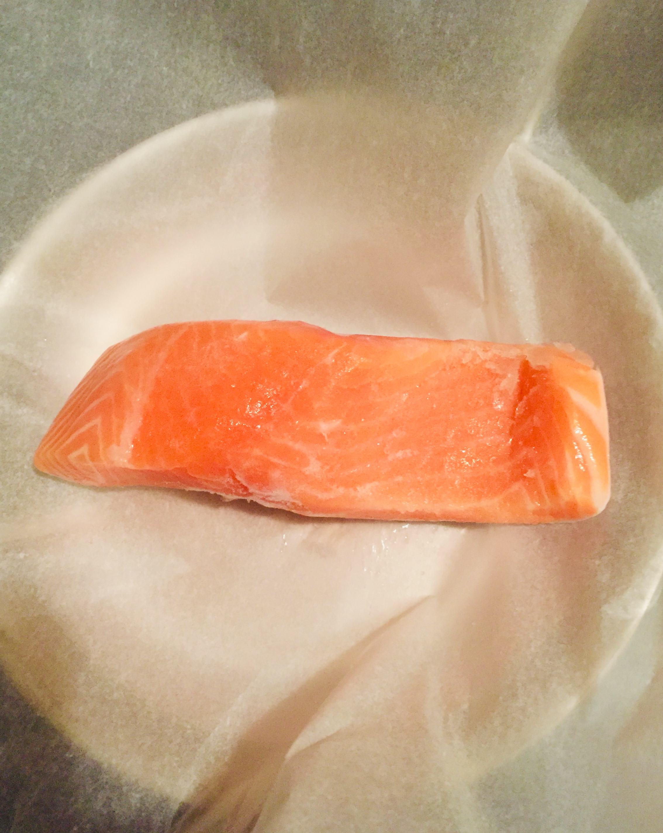 #1 연어를 물에 씻은 후 베이킹 페이퍼를 팬에 깔고 연어를 올려놓는다.