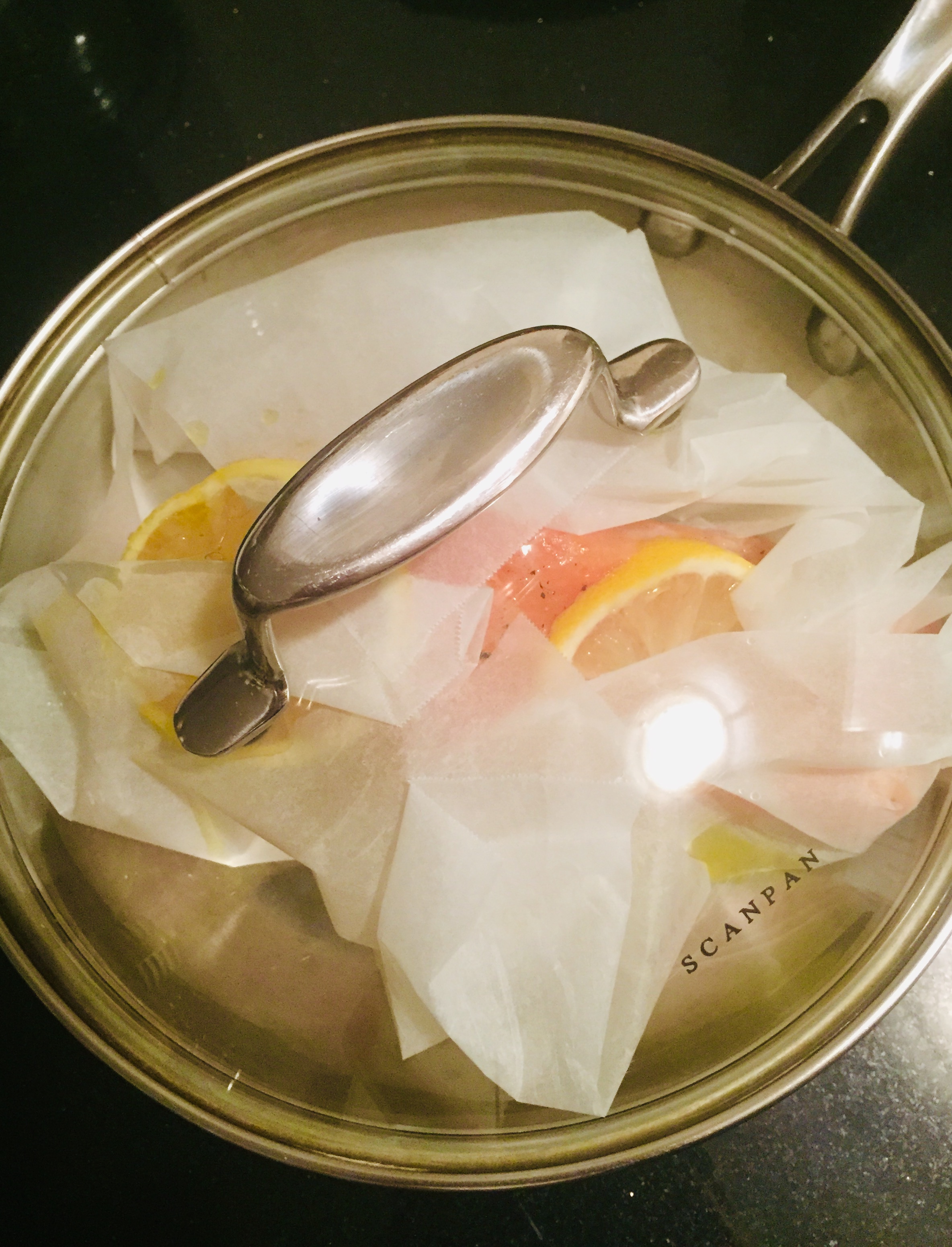 #3 여유분의 베이킹 페이퍼를 접어 연어를 씌우고 팬 뚜껑을 덮으면 준비 끝!
