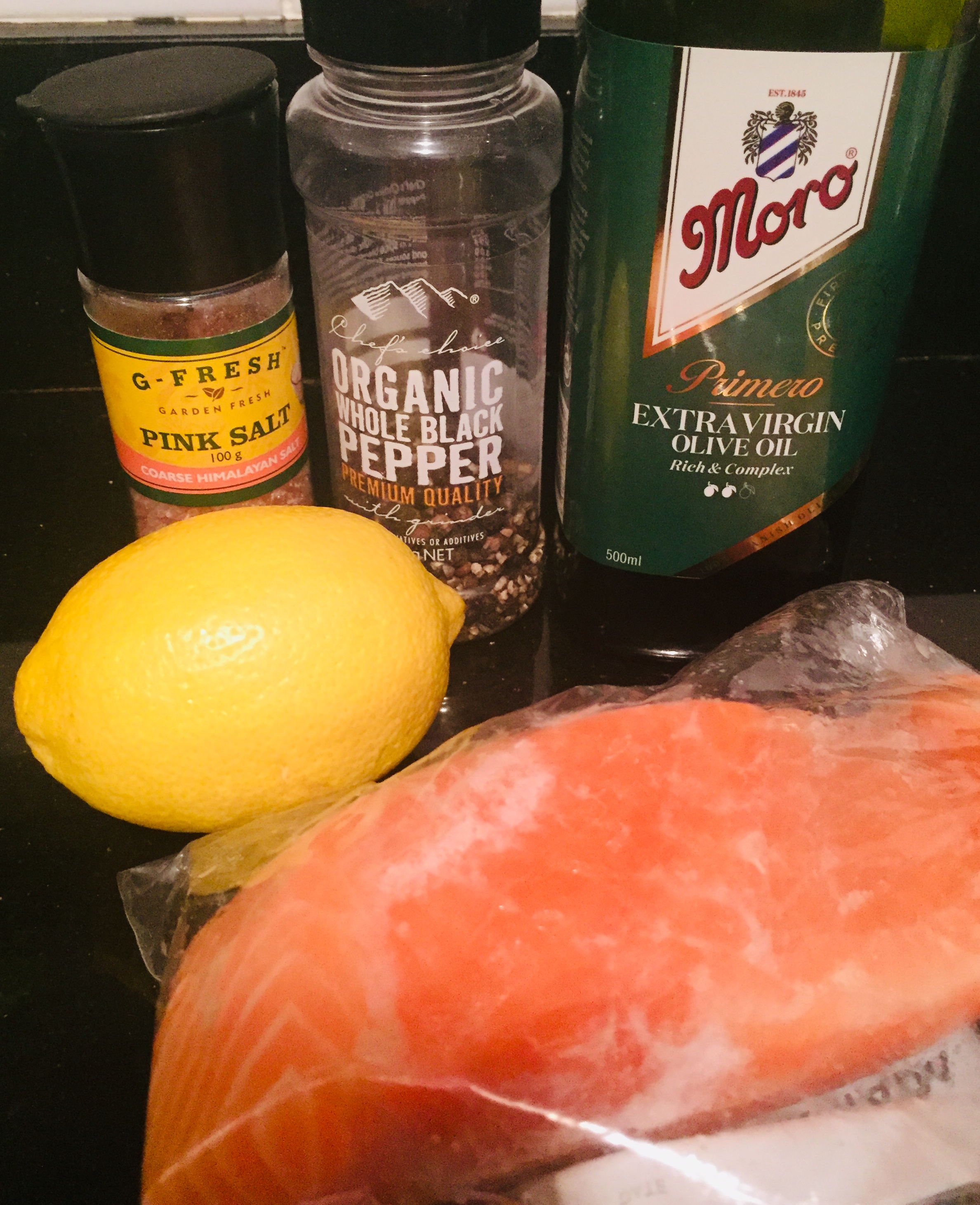 재료 준비: 연어, 레몬, 소금, 후추, 올리브 오일