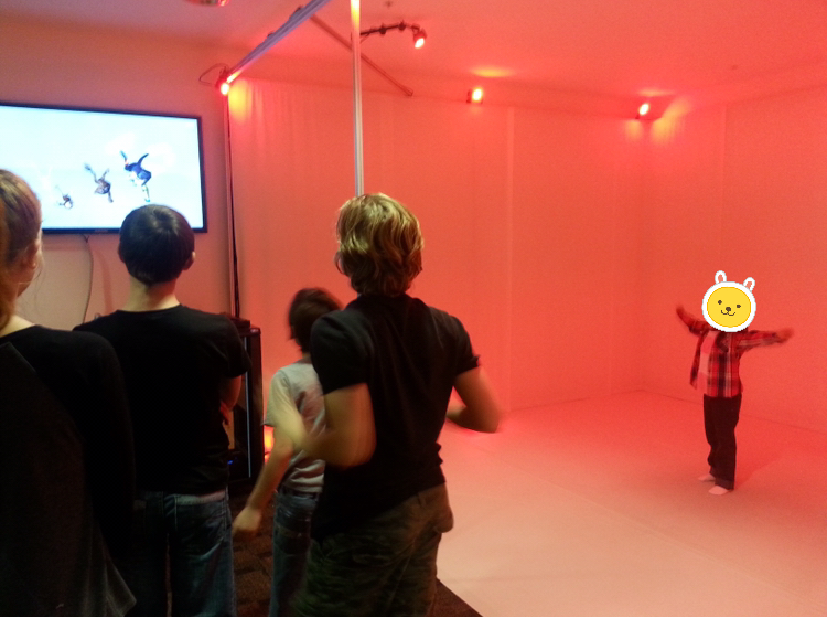 사진에 보이는 빨간색 조명의 방에 들어가서 아이들이 동작을 하면 모션이 캡처가 되어 화면에 그림으로 입힌 모습이 나오게 됩니다.