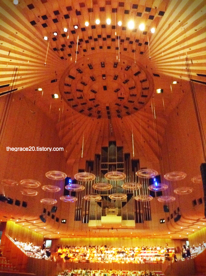 오페라 하우스에서 가장 큰 공연장입니다. 오래전에 지어졌기 때문에 요즘 생겨난 공연장보다는 규모가 작지만, 2,000명 이상의 인원을 수용할 수 있고 높은 아치형의 천장과 세계 최대의 기계식 추적기 작동 파이프 오르간이 있습니다. 이걸 작동할 수 있는 분은 세계에서 한 명뿐이랍니다. 호주에는 세계에서 오랜 역사를 가지고 있는 큰 파이프 오르간이 세 개가 있는데, 하나는 시드니 타운 홀, 다른 하나는 St. Mary 성당 그리고 오페라 하우스입니다. 이곳에서는 오케스트라 공연을 주로 하는데 현대 음악도 공연합니다. 오래전에는 권투 경기도 했답니다.